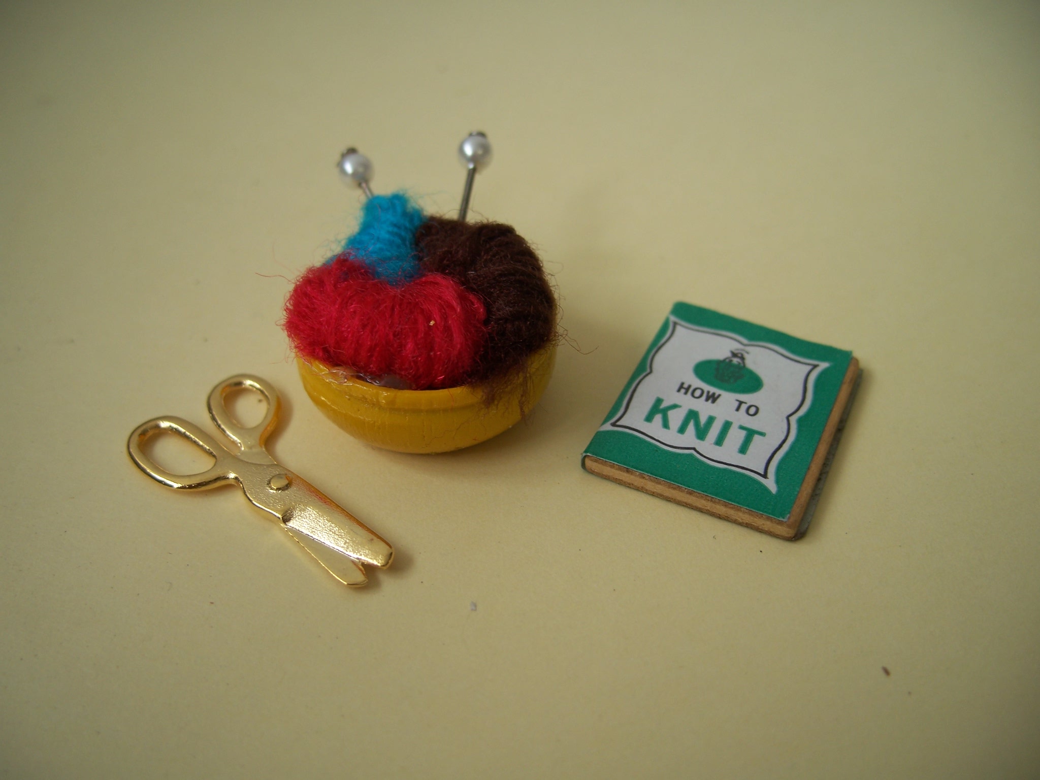 Kniting Set – Basket of wool with needles, scissors & knit book.